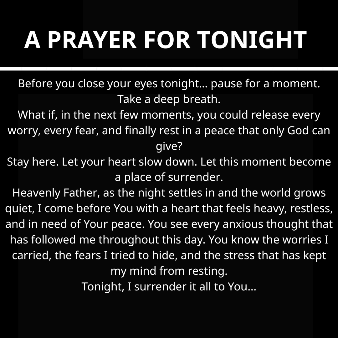 Heavenly Father, as the night settles in and the world grows quiet, I come before You with a heart that feels heavy, restless, and in need of Your peace. You see every anxious thought that has followed me throughout this day. You know the worries I carried, the fears I tried to hide, and the stress that has kept my mind from resting.