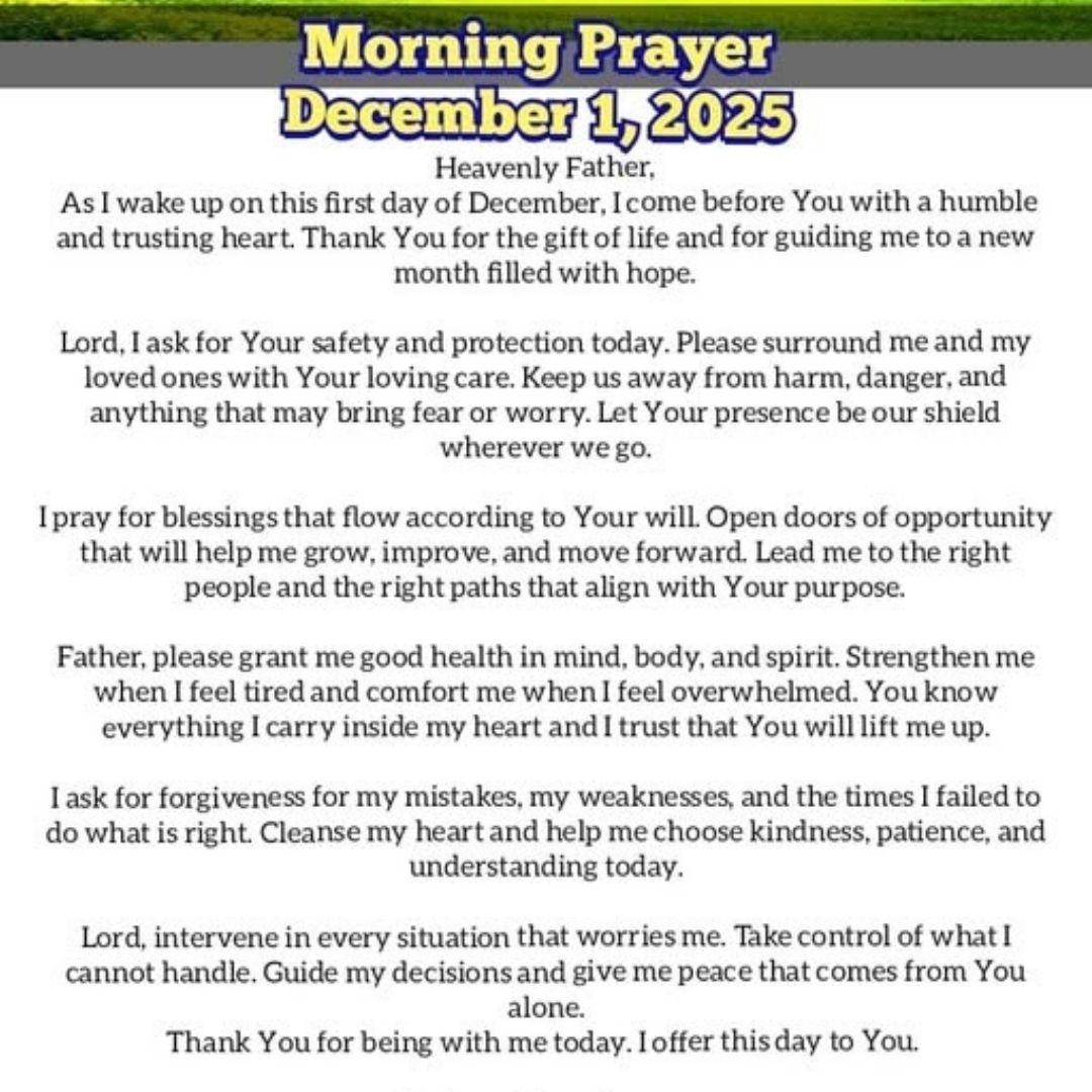 Lord, as I begin this new month, I place my thoughts, my strength, and my plans in Your hands. Let everything I do today reflect Your love and Your peace. Heavenly Father, on this new morning I lift my eyes to You—to the heights where You reign with power and glory.