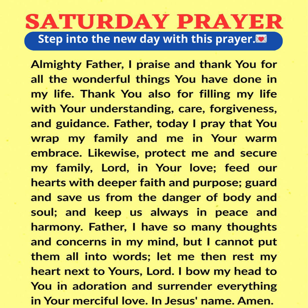 My God, I give You my will. I give You my goals, my plans, my worries, and my joys. Take control of my day, my thoughts, and my emotions. May everything I do today align with Your will, and may my heart never lose the desire to please You. If I face obstacles, give me patience. If I meet difficult people, give me love. If I must wait, teach me to wait with faith.